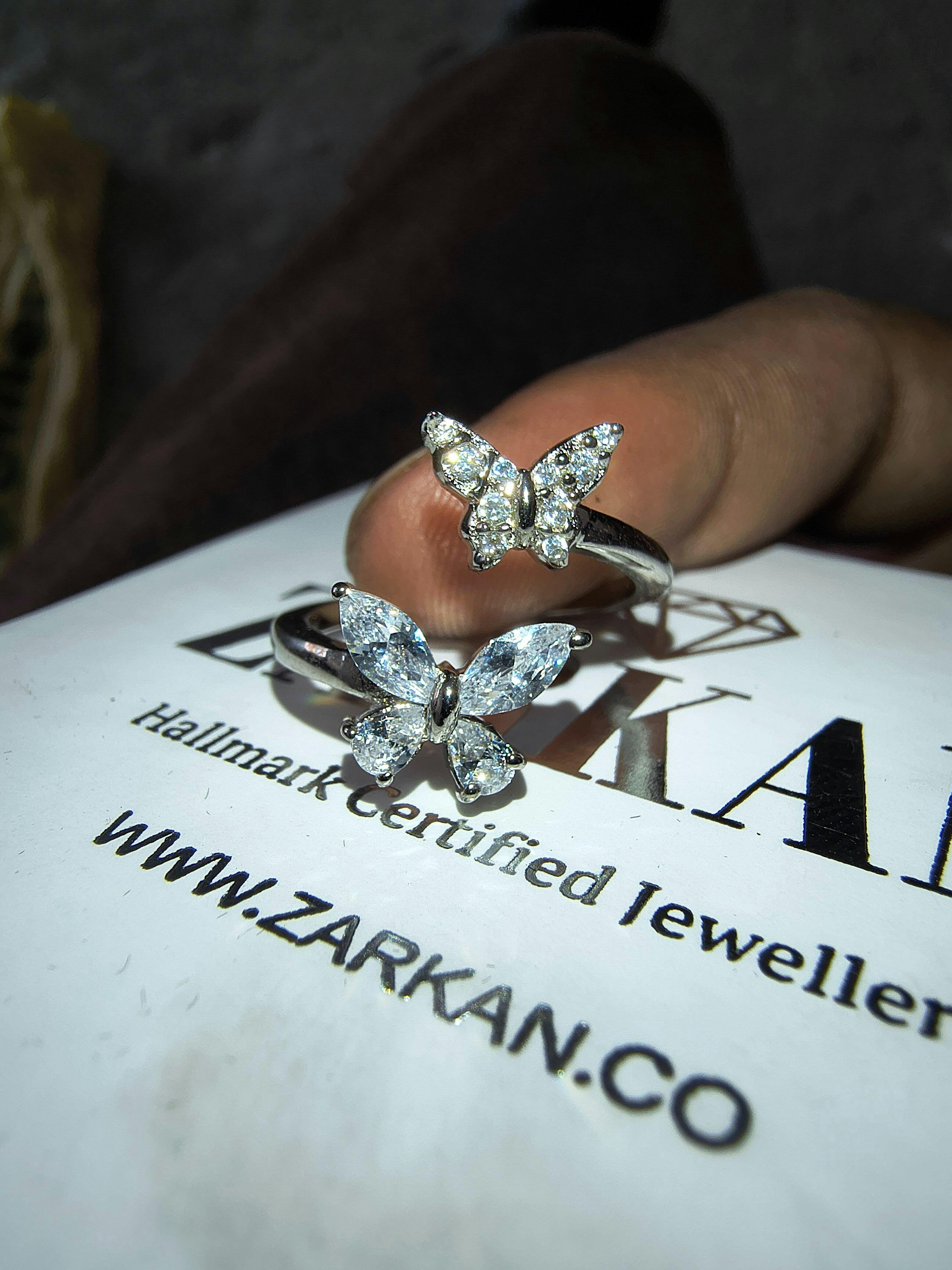 Indulge in luxury with our Hallmark Silver Sparkling Butterfly Ring. Featuring a delicate butterfly design and shimmering silver, this ring is a true statement piece. Elevate your style with elegance and sophistication.
